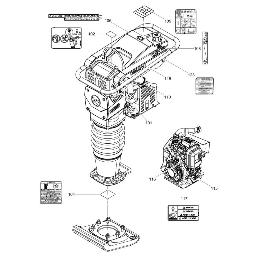 Decals for the Wacker BS60-4As Trench Rammer are essential for maintaining the machine's appearance and ensuring compliance with safety standards. These genuine Wacker Neuson parts are designed to fit perfectly and withstand the rigours of construction environments. Available in various designs and sizes, they help identify controls and provide important operational information.