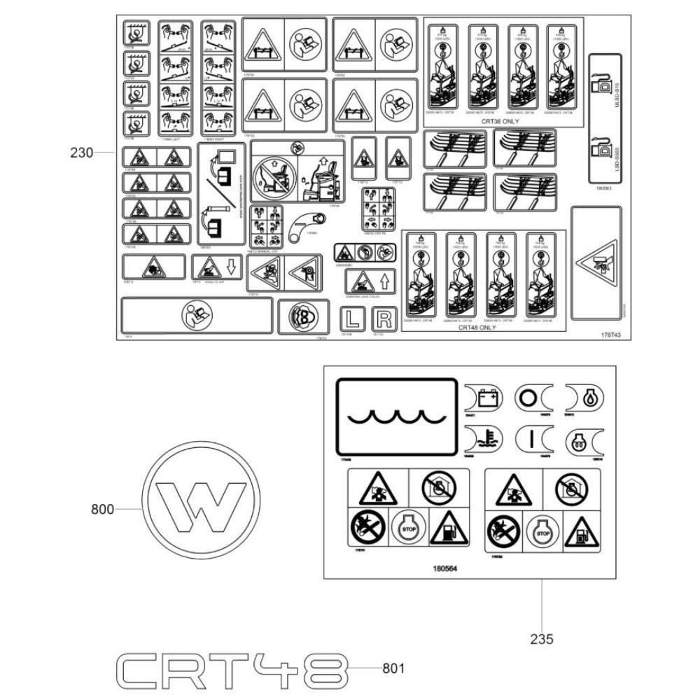 Decals for the Wacker CRT 48-35V Ride-On Trowel are essential for maintaining the machine's professional appearance and ensuring safety information is clearly visible. These genuine Wacker Neuson parts are designed to fit perfectly and withstand the rigours of construction environments. Available in various designs and sizes to suit different parts of the trowel.