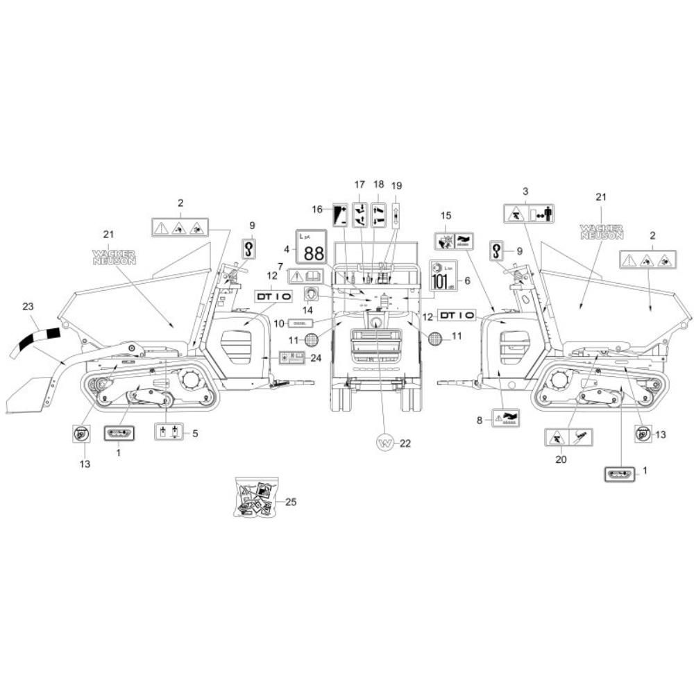 Decals for the Wacker DT10 Track Dumper are essential for maintaining the machine's appearance and ensuring safety information is visible. These genuine Wacker Neuson parts are designed to withstand outdoor conditions and provide clear, durable markings. Ideal for replacing worn or damaged decals, they help keep your track dumper compliant with safety standards.