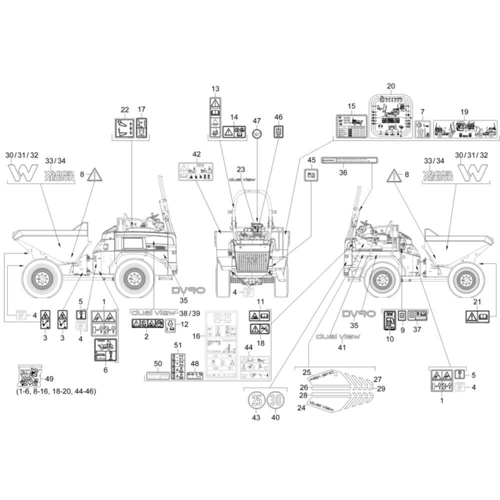 Decals for the Wacker DV90 Dumper are essential for maintaining the machine's appearance and ensuring compliance with safety and operational standards. These genuine Wacker Neuson parts are designed to fit perfectly, providing clear and durable markings. Ideal for replacing worn or damaged decals, they help in identifying controls, warnings, and branding on the dumper.