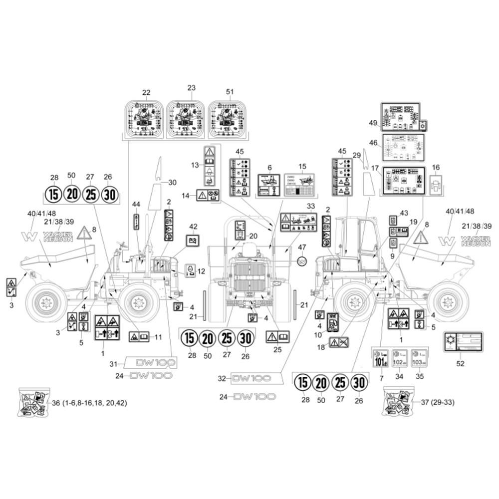 Decals for the Wacker DW100 Dumper are essential for maintaining the machine's appearance and ensuring safety information is clearly visible. These genuine Wacker Neuson parts are designed to fit perfectly and withstand the rigours of construction environments. Available in various designs and sizes, they help keep your equipment compliant and looking professional.