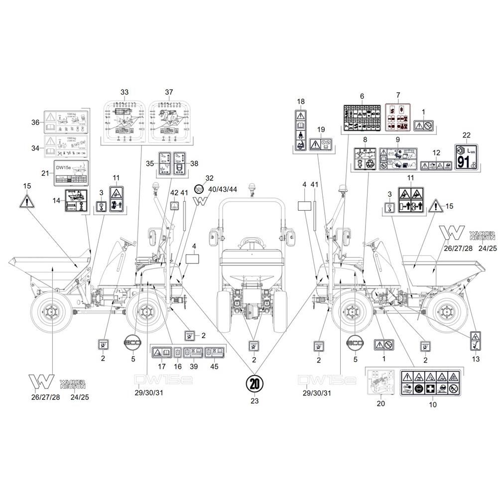 Decals for the Wacker DW15e Dumper are essential for maintaining the machine's appearance and ensuring compliance with safety standards. These genuine Wacker Neuson parts are designed to withstand outdoor conditions, providing clear and durable markings. Ideal for replacing worn or damaged decals, they help in identifying controls and safety information.