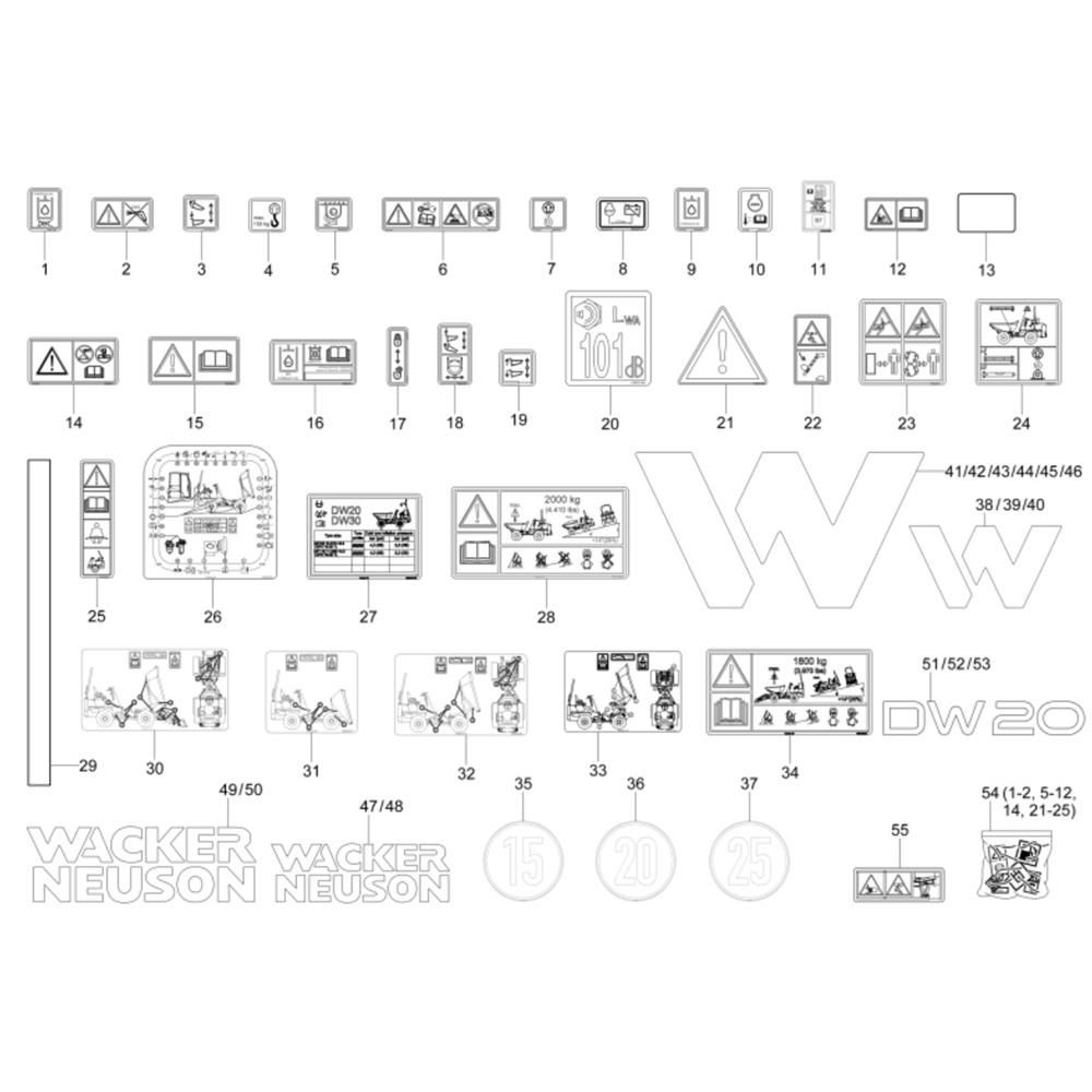 Decals for the Wacker DW20 Dumper are essential for maintaining the machine's professional appearance and ensuring safety information is clearly visible. These genuine Wacker Neuson parts are designed to withstand harsh outdoor conditions, providing durability and longevity. Available in various designs and sizes, they help keep your equipment compliant and easily identifiable.