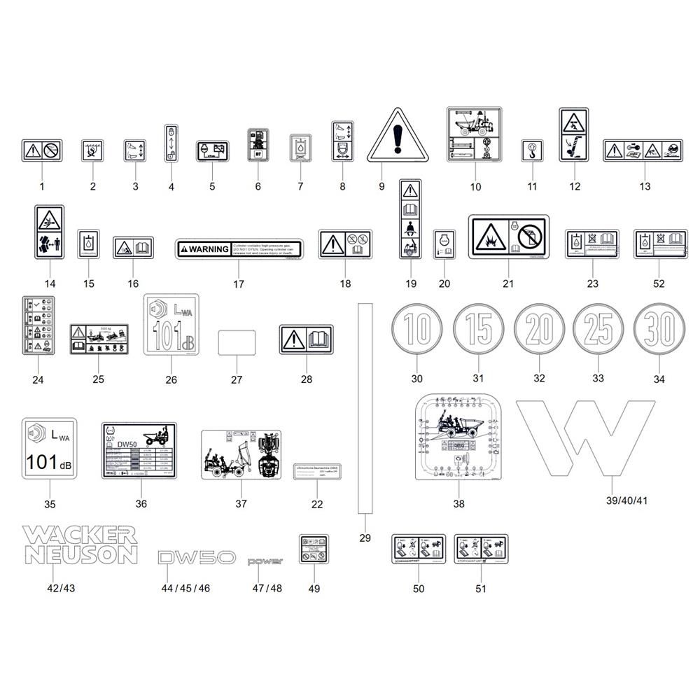 Decals for the Wacker DW50-2 Dumper are essential for maintaining the machine's professional appearance and ensuring safety information is visible. These genuine Wacker Neuson parts are designed to fit perfectly and withstand the rigours of construction environments. Available in various designs and sizes to suit different parts of the dumper.