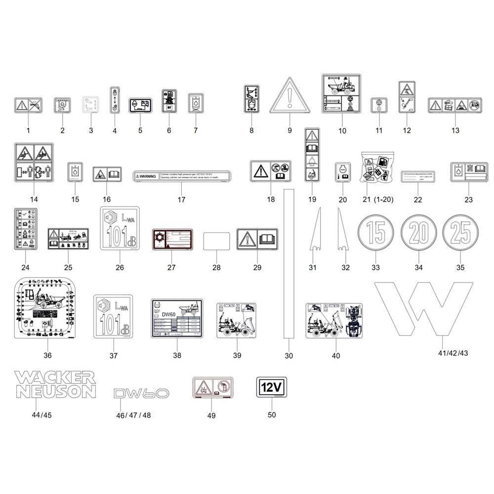 Decals for the Wacker DW60-2 Dumper are essential for maintaining the machine's appearance and ensuring compliance with safety standards. These genuine Wacker Neuson parts are designed to fit perfectly, providing clear and durable markings. Ideal for replacing worn or damaged decals, they help maintain the professional look and functionality of your equipment.