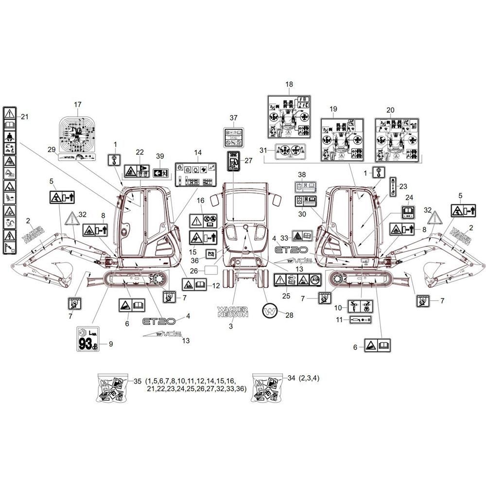 Decals for the Wacker ET20 Mini Excavator are essential for maintaining the machine's appearance and ensuring safety information is clearly visible. These genuine Wacker Neuson parts are designed to withstand outdoor conditions, providing durability and longevity. Available in various designs and sizes to fit different parts of the excavator, they help in easy identification and operation.