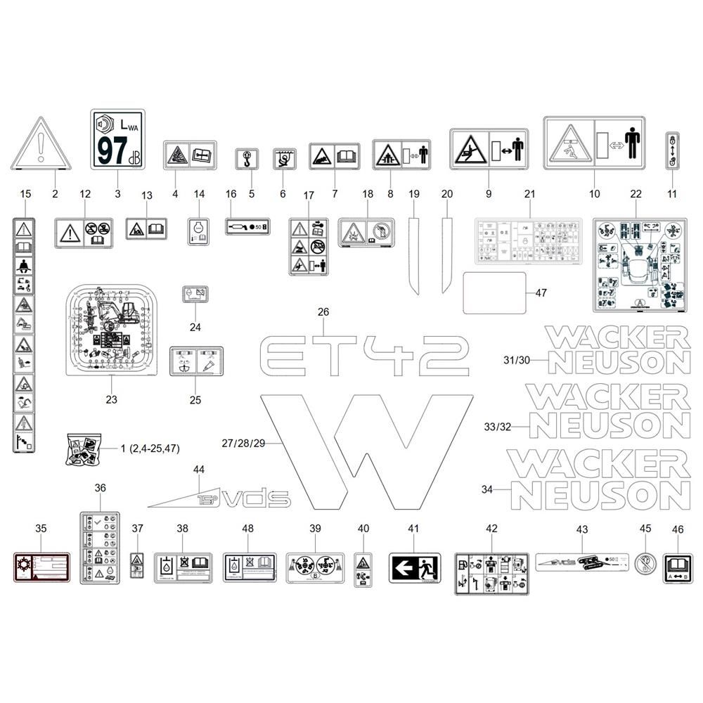 Decals for the Wacker ET42 Mini Excavator are essential for maintaining the machine's appearance and ensuring compliance with safety and operational standards. These genuine Wacker Neuson parts are designed to withstand harsh conditions, providing clear and durable markings. Available in various designs to suit different needs.