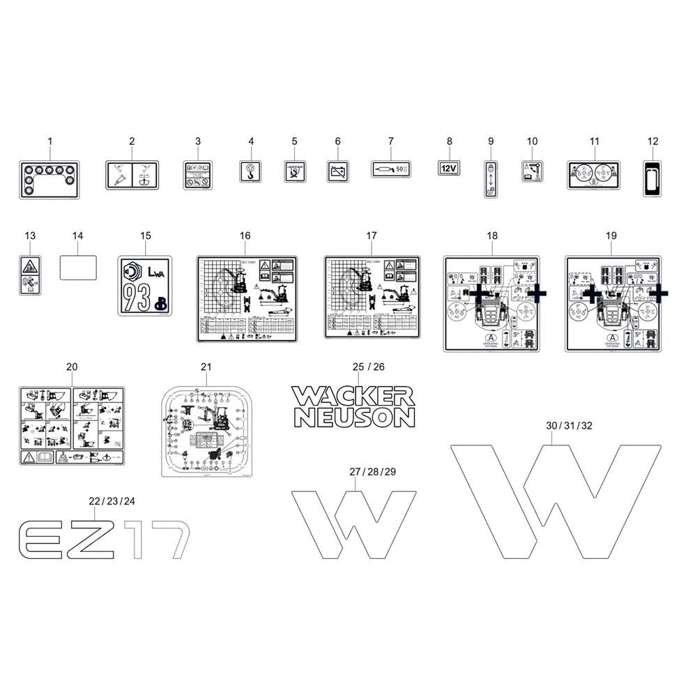 Decals for the Wacker EZ17-2 Mini Excavator are essential for maintaining the machine's professional appearance and ensuring safety compliance. These genuine Wacker Neuson parts are designed to withstand harsh outdoor conditions, providing durability and longevity. Available in various designs and sizes to fit different parts of the excavator, they help in identifying and branding the equipment effectively.
