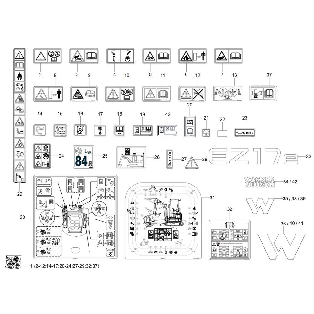 Decals for the Wacker EZ17e Mini Excavator are essential for maintaining the machine's appearance and ensuring safety information is clearly visible. These genuine Wacker Neuson parts are designed to fit perfectly, providing durability and resistance to outdoor conditions. Ideal for replacing worn or damaged decals, they help keep your excavator compliant with safety standards.