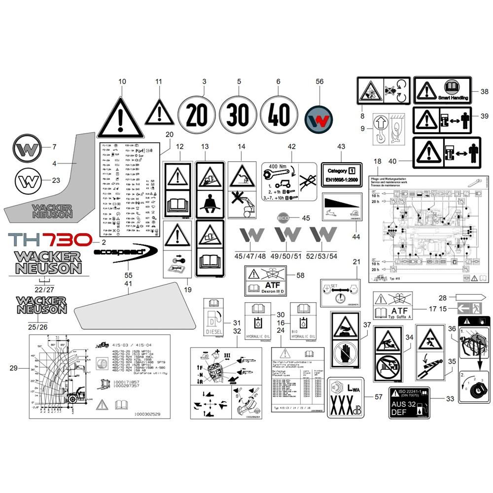 Decals for the Wacker TH730 (415-14) Telehandler are designed to ensure clear identification and safety compliance. These genuine Wacker Neuson parts are essential for maintaining the telehandler's professional appearance and operational standards. Available in various designs and sizes, they are suitable for different parts of the machine, ensuring visibility and durability.