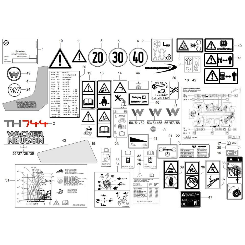 Decals for the Wacker TH744 (416-12) Telehandler are essential for maintaining the machine's appearance and ensuring safety information is visible. These genuine Wacker Neuson parts include various labels and markings that help identify controls, warnings, and operational guidelines. Suitable for routine updates or replacements, these decals ensure compliance and enhance the telehandler's professional look.
