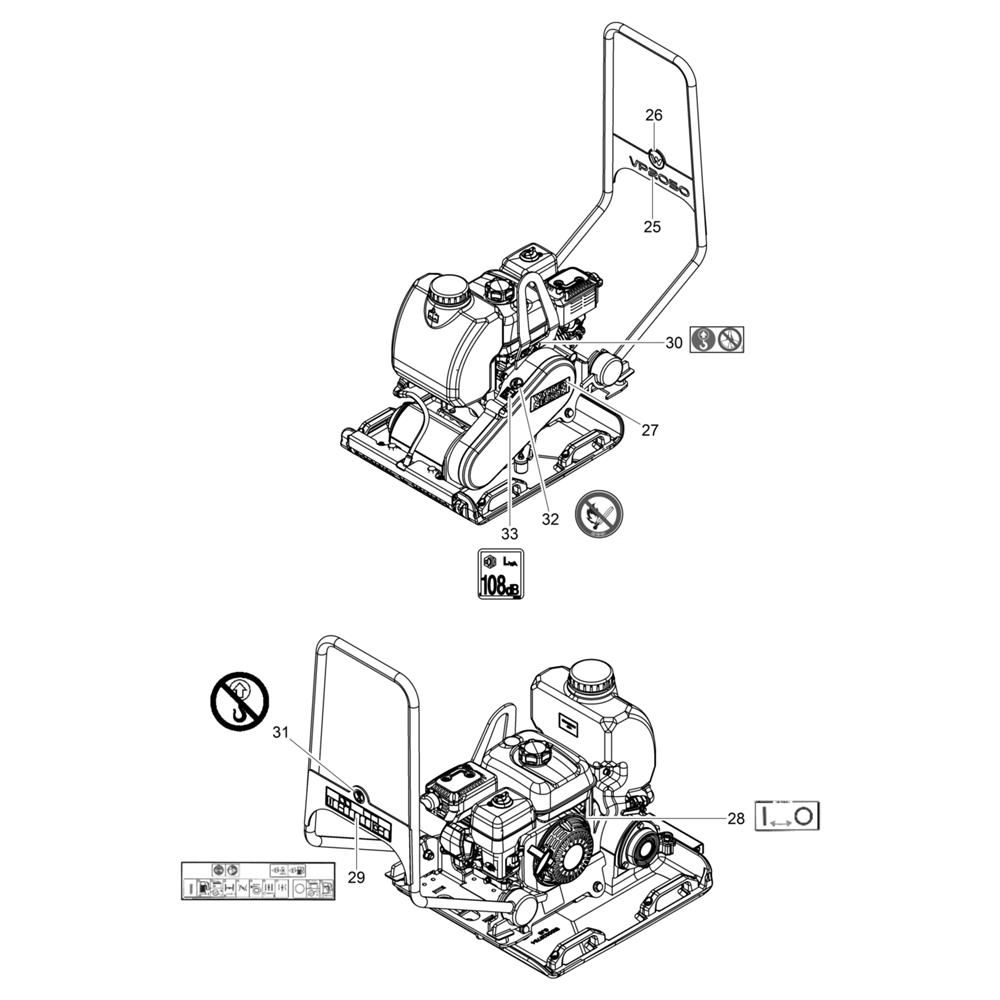 Decals for the Wacker VP2050Aw Compactor are essential for maintaining the machine's appearance and ensuring compliance with safety standards. These genuine Wacker Neuson parts are designed to fit perfectly and withstand the rigours of regular use. Available in various designs and sizes, they help in identifying controls and providing necessary operational information.