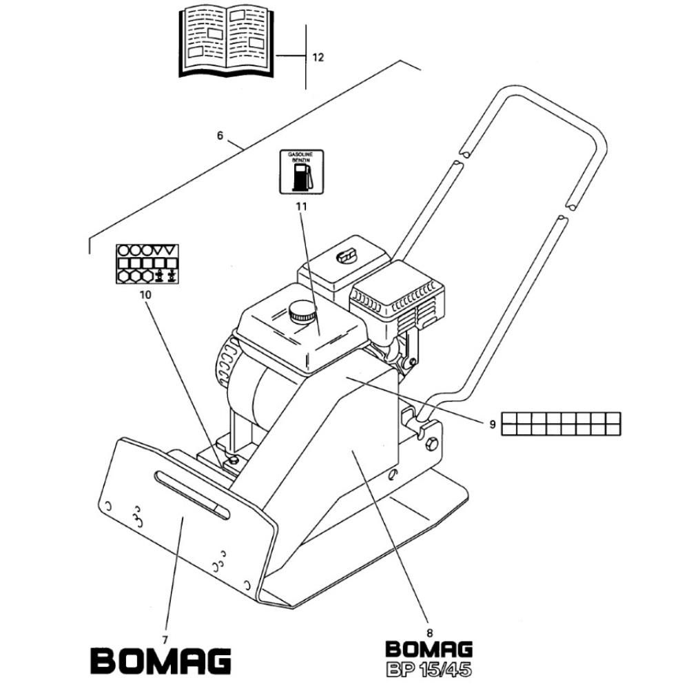 The Decals and Manuals Assembly for Bomag BP 15/45 Compactors includes essential documentation and identification markings for proper operation and maintenance. Genuine Bomag parts ensure compatibility and reliability, providing clear instructions and safety information. This assembly helps operators maintain equipment efficiency and adhere to safety standards.