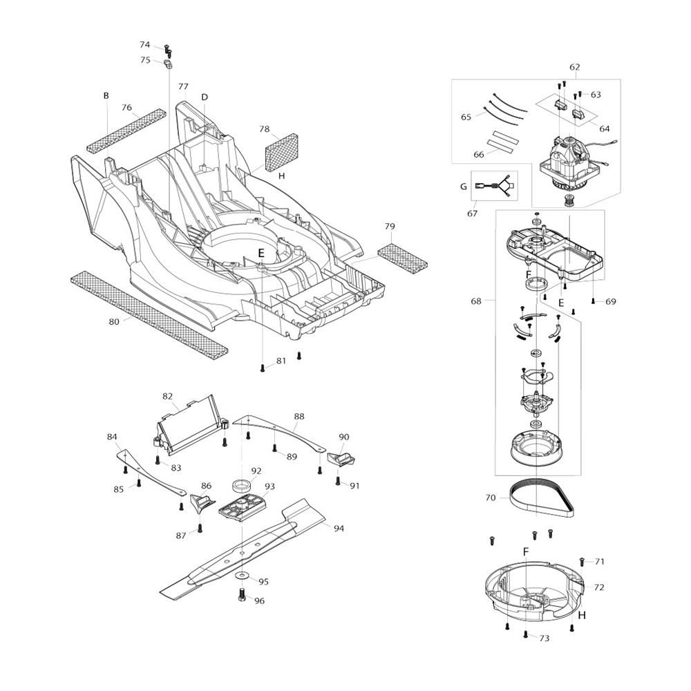 The Deck and Motor Assembly for the Makita ELM3720 Mower includes essential components to ensure efficient mowing performance. This assembly features genuine Makita parts designed for durability and reliability. It includes the mower deck and motor, crucial for maintaining optimal cutting and propulsion. Suitable for routine maintenance and repairs, these components help extend the mower's service life.