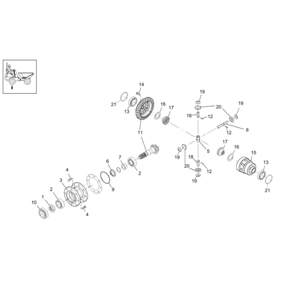 The Differential Axle Assembly for the Wacker 6001 Dumper is designed to ensure optimal performance and durability. This assembly plays a crucial role in distributing power to the wheels, enhancing traction and stability. It includes components such as gears, shafts, and bearings, essential for maintaining the dumper's efficiency and reliability.