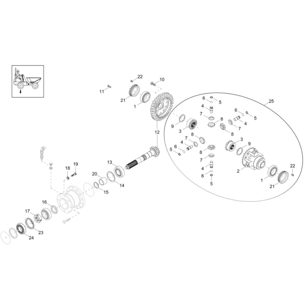 The Differential Axle Assembly for the Wacker DV100 Dumper is designed to ensure optimal performance and reliability. This assembly plays a crucial role in the dumper's drivetrain, facilitating smooth power transmission and efficient load handling. Components typically include gears, bearings, and seals, all engineered to withstand demanding conditions. Suitable for routine maintenance and repair tasks, this assembly helps maintain the dumper's operational efficiency.