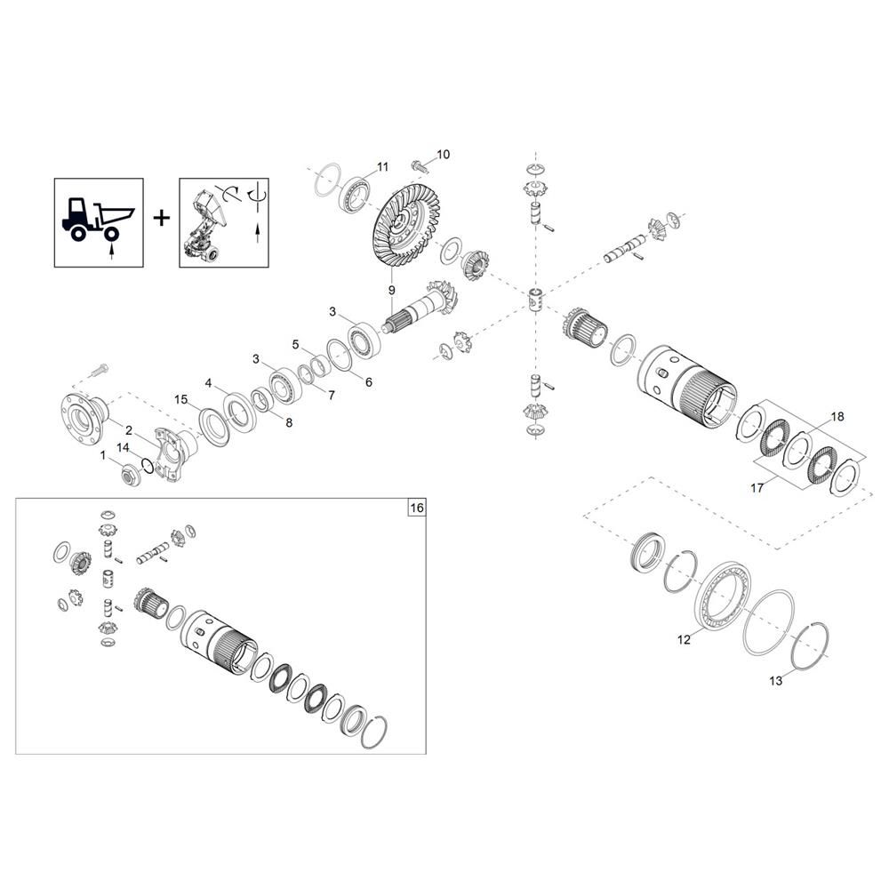 The Differential Axle Assembly for the Wacker DW20-2 Dumper is designed to ensure optimal performance and durability. This assembly includes key components such as gears, shafts, and bearings, which work together to distribute power evenly to the wheels, enhancing traction and stability. Ideal for maintaining the efficiency and reliability of your dumper.