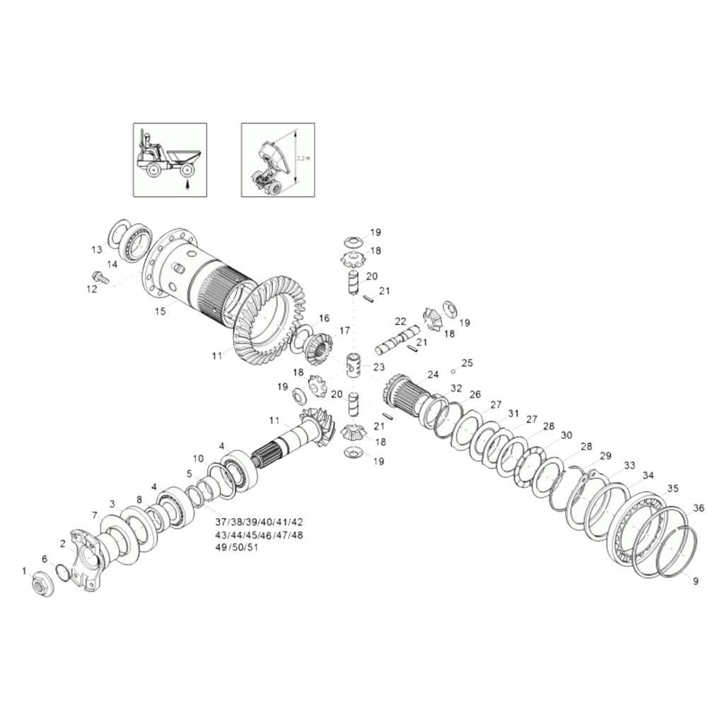 The Front Differential Axle Assembly for the Wacker 3001AE Dumper is designed to ensure optimal performance and durability. This assembly includes key components such as gears, bearings, and seals, which work together to distribute power efficiently to the wheels. Essential for maintaining the dumper's manoeuvrability and load-bearing capabilities, it is a crucial part of regular maintenance.