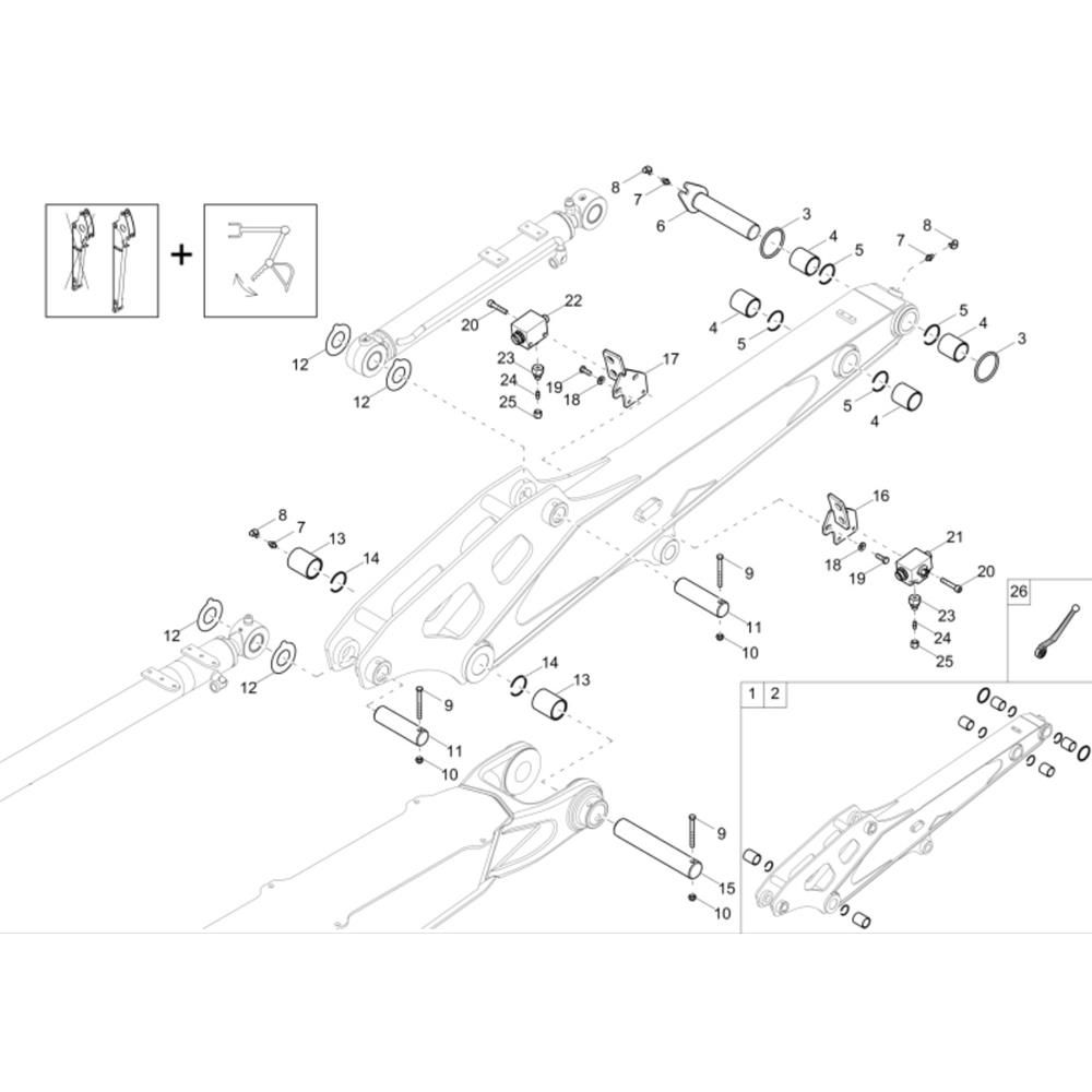 The Dipperstick (Long) Assembly for the Wacker EZ50 Mini Excavator is designed to enhance the machine's digging capabilities. This assembly includes components such as pins, bushings, and hydraulic cylinders, ensuring efficient operation and durability. Ideal for construction and landscaping tasks, it supports precise excavation and material handling.