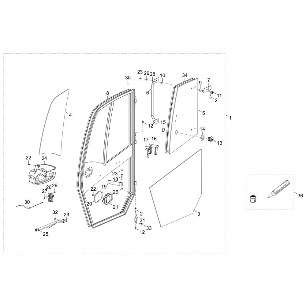 The Door Assembly for the Wacker TH522 Telehandler includes essential components to ensure safe and efficient operation. Designed specifically for the Wacker Neuson model, this assembly helps maintain the integrity of the cab, providing protection and accessibility. Typical components may include hinges, seals, and handles, ensuring a secure fit and reliable performance.