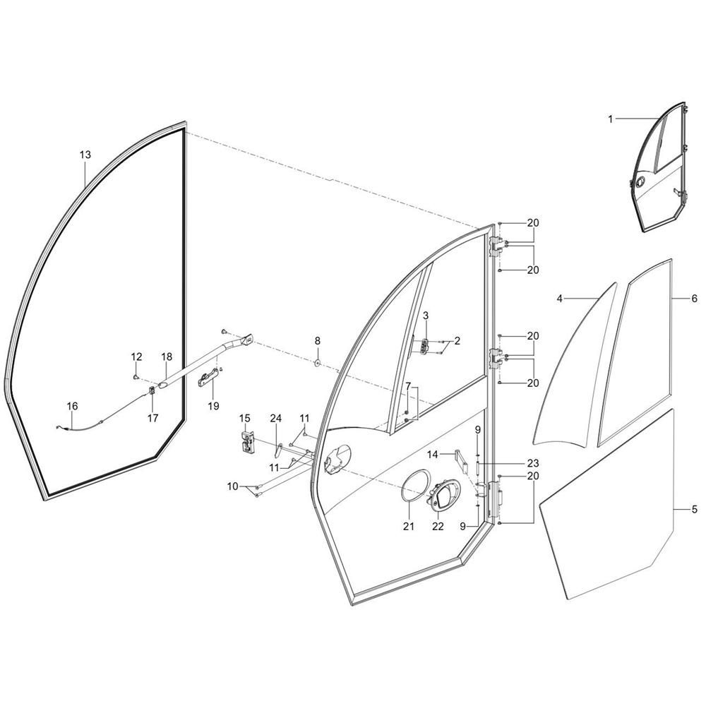 The Door Assembly for the Wacker TH627 Telehandler includes essential components to ensure safe and efficient operation. This assembly is crucial for maintaining the integrity and functionality of the telehandler's cabin, providing protection and accessibility. Genuine Wacker Neuson parts ensure compatibility and reliability, contributing to the machine's overall performance.