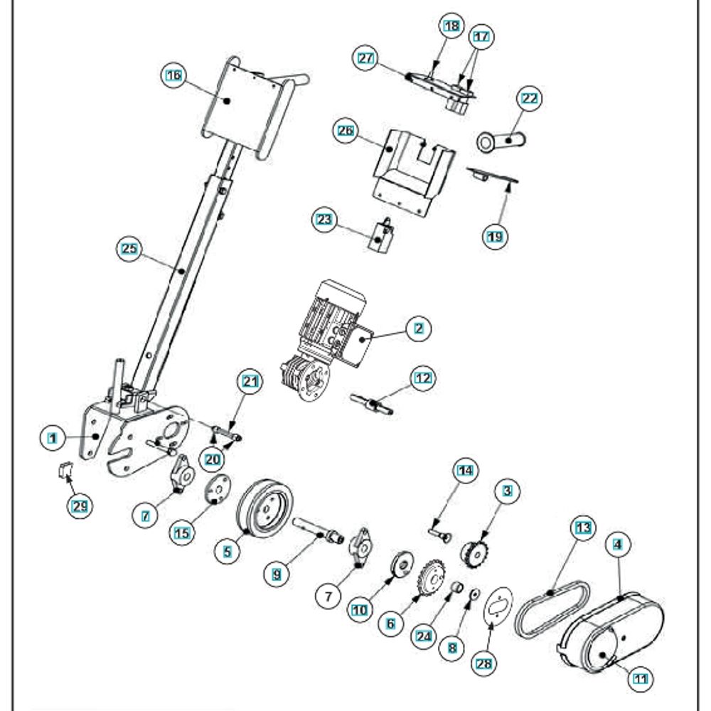 The Drive Assembly for the Husqvarna BLASTRAC 1-8DPS55 Concrete Shot Blaster is designed to ensure efficient operation and longevity. This assembly includes critical components such as gears, belts, and pulleys, which work together to drive the machine effectively. Regular maintenance of these parts is essential for optimal performance and to prevent downtime during concrete blasting tasks.