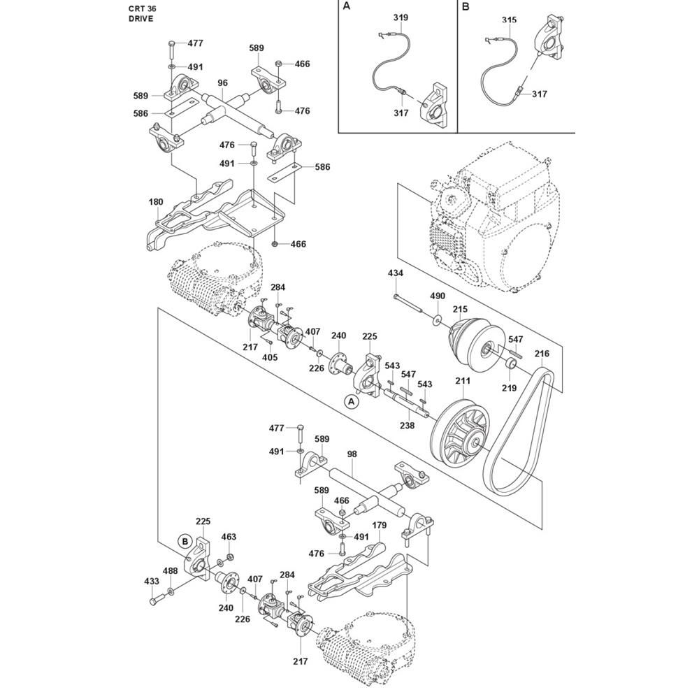 The Drive Assembly for the Husqvarna CRT 36 Trowel is essential for ensuring smooth operation and optimal performance. This assembly includes critical components such as belts, pulleys, and gears, which work together to transmit power efficiently. Designed for durability and reliability, it helps maintain the trowel's functionality in demanding construction environments.