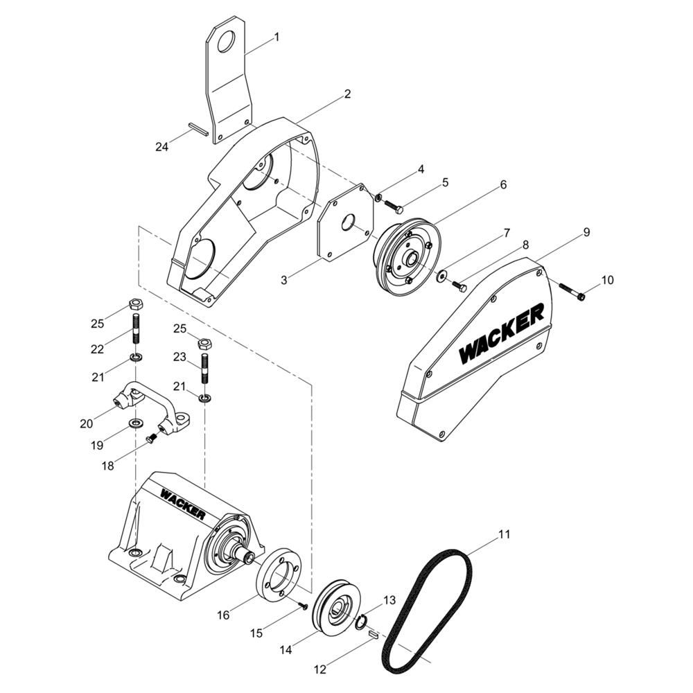 The Drive System Assembly for the Wacker BPS2550A Plate Compactor includes key components essential for the machine's operation. This assembly ensures efficient power transmission and smooth operation. Typical parts may include belts, pulleys, and shafts, all designed to maintain the compactor's performance and reliability.