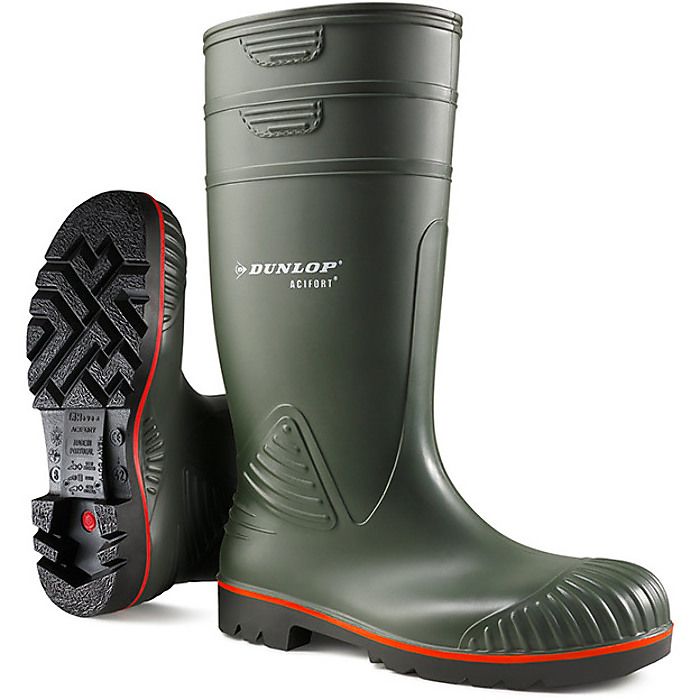 Dunlop has improved its Acifort Agri Range. The Acifort Heavy Duty Full Safety now features a dark green shaft, black outer sole with a third, red intermediate layer (NEW) for immediate safety recognition. The boot is certified according to the most recent European standards. A practical and durable work boot for farm work. Excellent resistance to various liquids and materials and a good life span. Ideal for less intensive and general tasks on the farm. Features a steel-tipped toe and steel mid-sole for impact and penetration protection. , Toecap protection , mid-sole protection , Energy absorbing sole , Antistatic , Slip resistant , 100% Waterproof , Resists minerals, animal and plant oils and fats, disinfectants, fertilizer, various chemicals , EN ISO20345:2011 S5 SRA