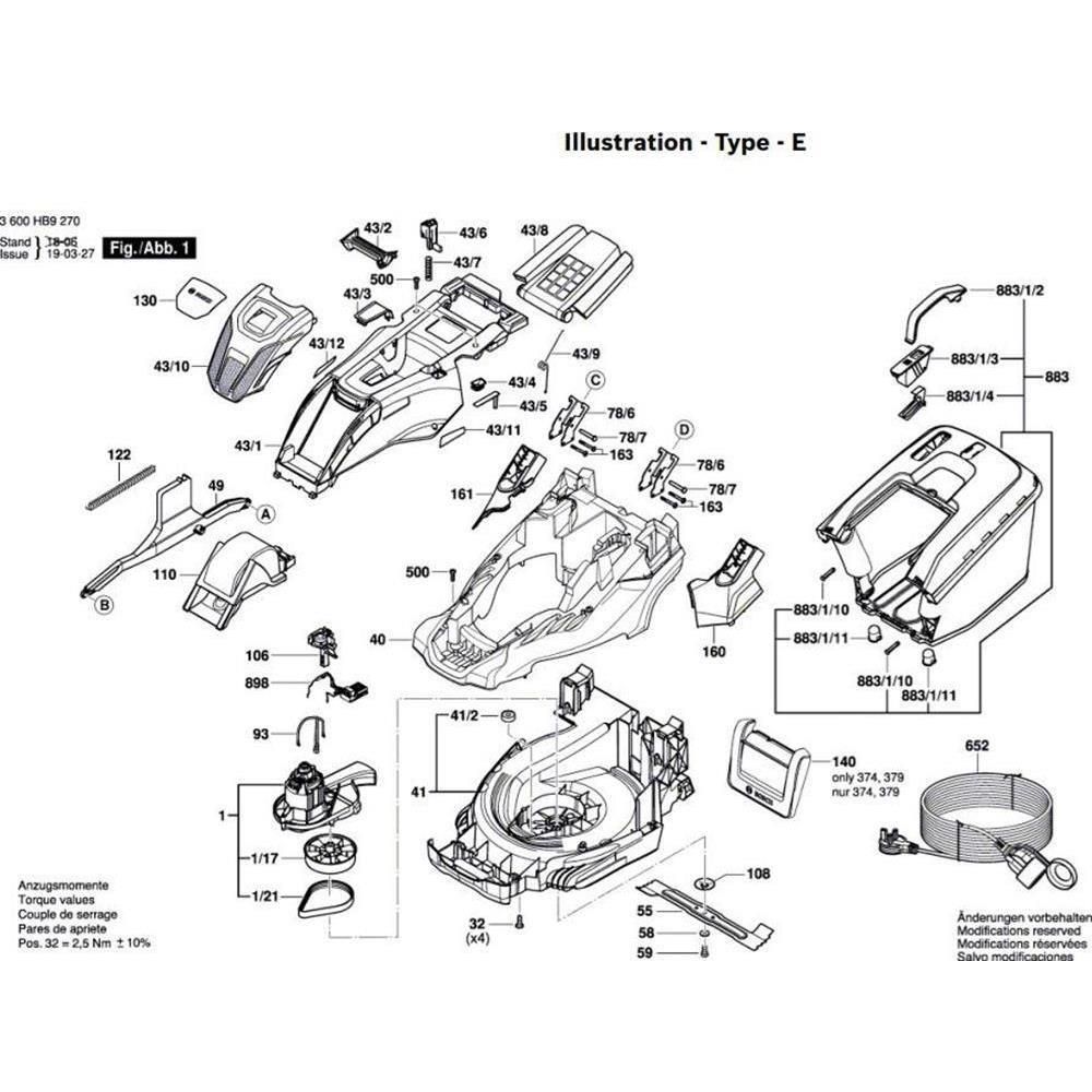 The Electric Lawnmower Assembly for Bosch AdvancedRotak 750 includes genuine Bosch spare parts designed to ensure optimal performance and longevity. This assembly is crucial for maintaining the mower's efficiency, providing essential components such as blades, belts, and fasteners. Ideal for routine maintenance and repairs, it helps keep your lawnmower in top condition.