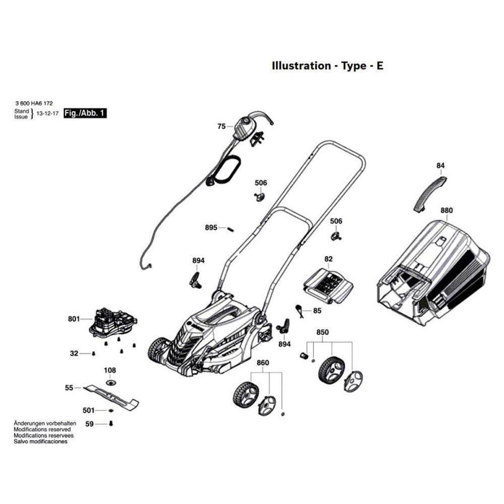 The Electric Lawnmower Assembly for Bosch Rotak 340 R includes essential components to ensure optimal performance and longevity of your mower. This assembly features genuine Bosch spare parts, designed to maintain the efficiency and reliability of the Rotak 340 R model. Components such as blades, belts, and switches are available to support routine maintenance and repairs.