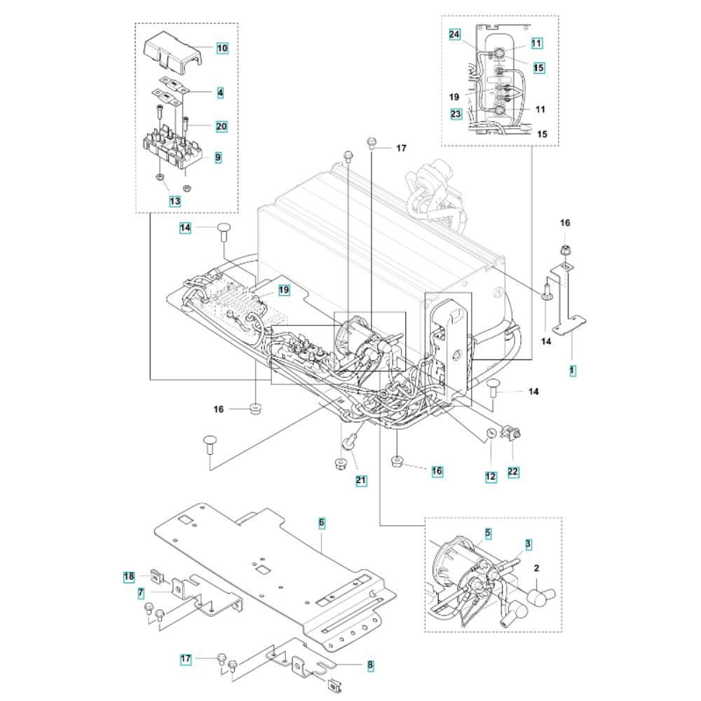 The Electrical Assembly for the Husqvarna R 200iX Ride-On Mower includes key components essential for the mower's electrical system. This assembly ensures efficient power distribution and reliable operation. Typical components may include wiring harnesses, connectors, and switches, all designed to maintain optimal performance. Genuine Husqvarna parts guarantee compatibility and durability.