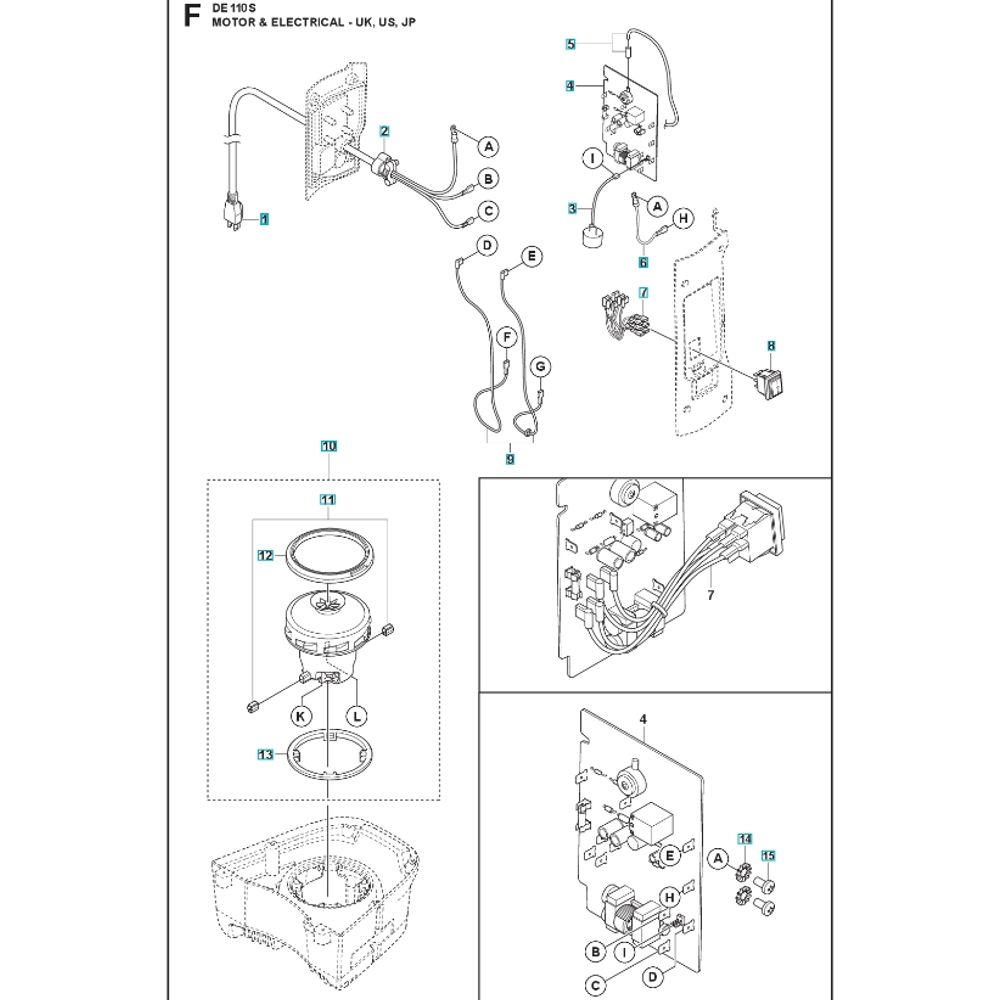 The Electrical Assembly for the Husqvarna DE110SH Dust Extractor includes key components to ensure efficient operation and maintenance. This assembly is crucial for powering and controlling the extractor, helping to maintain optimal dust extraction performance. Components may include wiring, connectors, and switches, all designed to fit seamlessly with the DE110SH model.