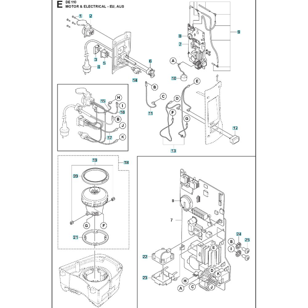 The Electrical Assembly for the Husqvarna DE110H Dust Extractor includes key components essential for the machine's operation. This assembly ensures efficient power distribution and control, maintaining optimal performance. Components may include wiring harnesses, connectors, switches, and circuit boards, all designed to meet Husqvarna's high standards. Regular maintenance of these parts can help extend the life of your dust extractor.