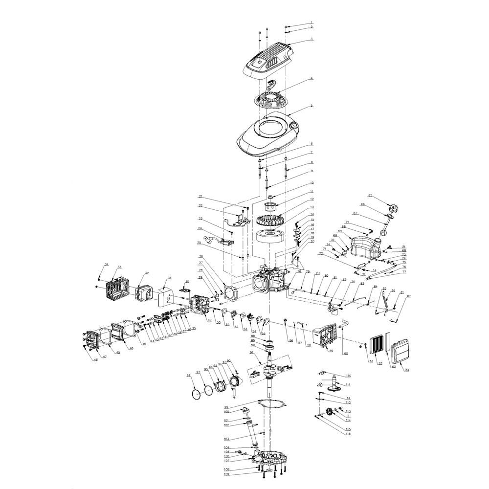 The Engine Assembly for the Harry LMG46S-B Mower includes key components to ensure optimal performance and longevity. Designed for routine maintenance and repair, it helps maintain engine efficiency and reliability. Typical parts include gaskets, springs, levers, and seals, all essential for smooth operation and reduced wear.