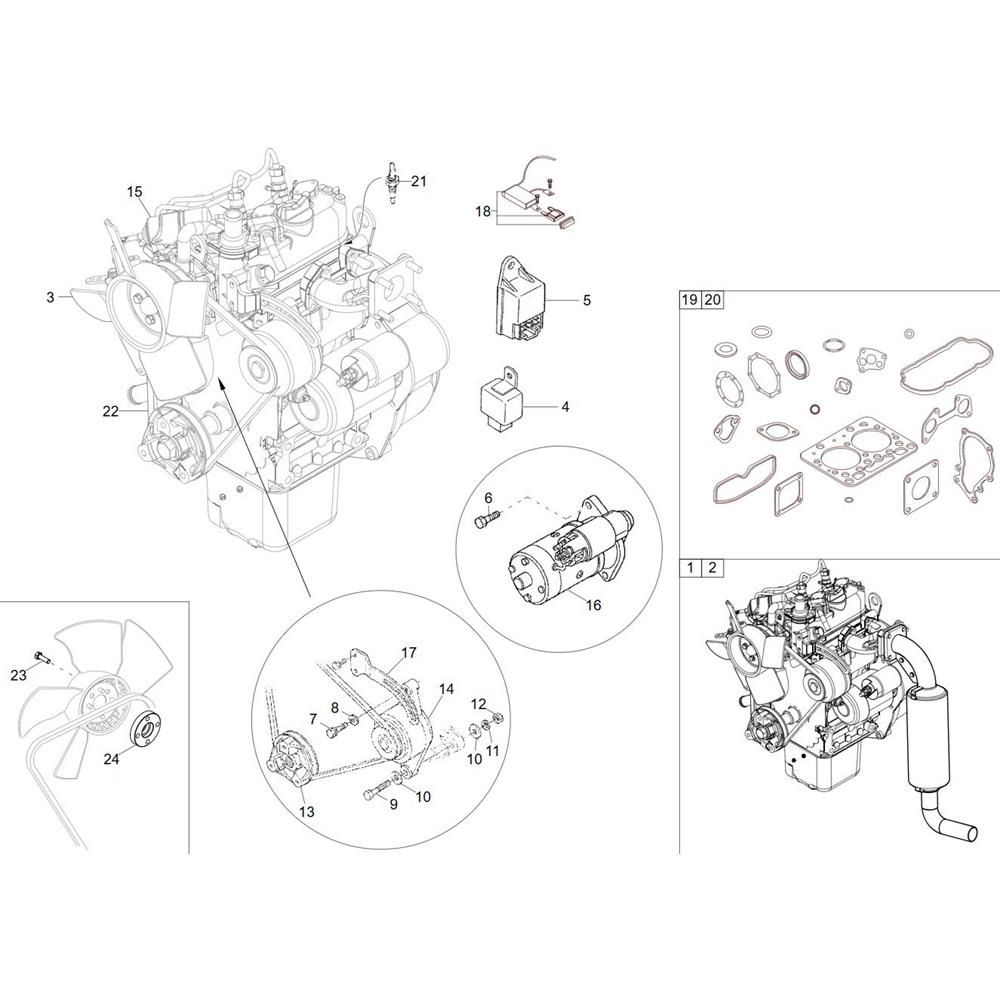 The Engine Assembly for the Wacker DT10 Track Dumper includes key components essential for optimal machine performance. This assembly ensures efficient power delivery and reliability in demanding conditions. Typical components include pistons, gaskets, and crankshafts, all designed to meet the rigorous standards of Wacker Neuson equipment.