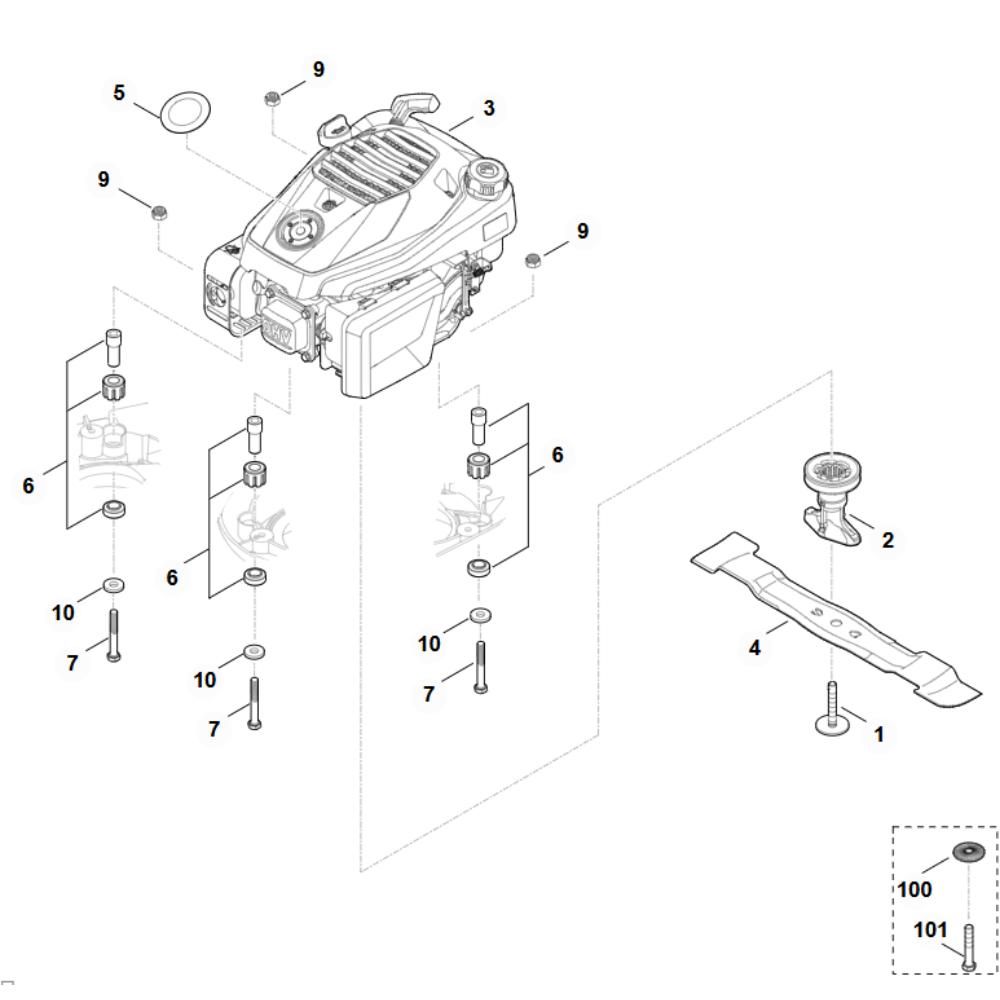 The Engine and Blade Assembly for the Stihl RM 453.3 T Lawn Mower ensures optimal cutting performance and engine reliability. This genuine Stihl part includes components like the blade, engine housing, and fasteners, designed to fit seamlessly with your mower. Regular maintenance with these parts helps maintain efficiency and prolongs the life of your lawn mower.