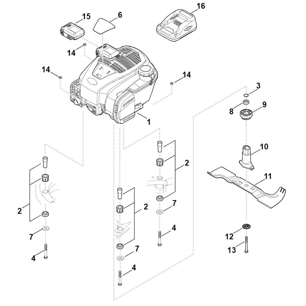 The engine and blade assembly for the Stihl RM 545.0 VE Mower ensures optimal cutting performance and reliable operation. This assembly includes essential components like the engine and cutting blade, designed to maintain the mower's efficiency and longevity. Genuine Stihl parts provide a perfect fit and are available in various specifications to suit different mowing needs.