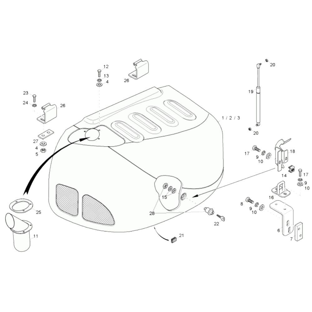 The Engine Hood Assembly for the Neuson 75Z3 Mini Excavator is designed to protect the engine components while ensuring easy access for maintenance. This assembly includes parts such as hinges, latches, and seals, which contribute to the durability and functionality of the excavator. Genuine Wacker Neuson parts ensure compatibility and reliability, maintaining the machine's performance.