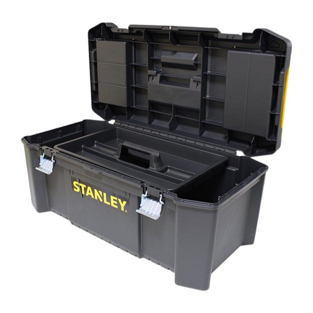 The Essential Toolbox 66cm (26in) by Stanley Tools is a robust and versatile storage solution for both professional tradespeople and DIY enthusiasts. Crafted from durable plastic, this toolbox is designed to withstand the rigours of daily use. It features an innovative internal tool tray and small top organisers in the lid, perfect for keeping small parts and tools neatly arranged. The ergonomic metal catches and geometric lock latches ensure smooth opening and closing, while the option to secure the box with a small padlock (not included) adds an extra layer of security against theft.