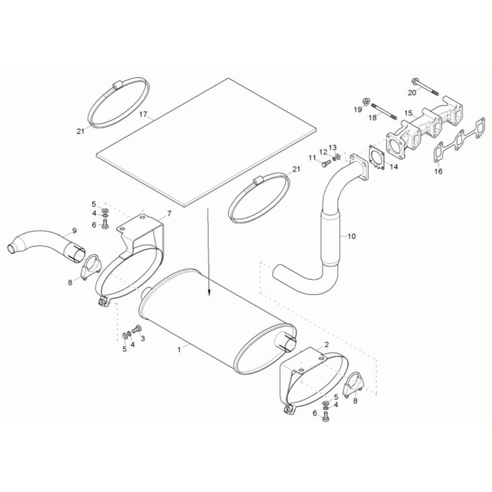 The Exhaust Assembly for the Neuson 38Z3 Mini Excavator is designed to efficiently manage engine emissions, ensuring optimal performance and compliance with environmental standards. This assembly includes components such as mufflers, pipes, and clamps, which work together to reduce noise and direct exhaust gases safely away from the engine. Genuine Wacker Neuson parts ensure compatibility and reliability.