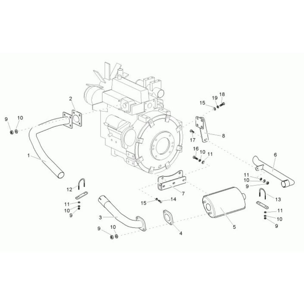 The Exhaust Assembly for the Wacker TD15 Track Dumper is designed to ensure optimal engine performance by effectively managing exhaust gases. This assembly includes components such as mufflers, pipes, and clamps, which work together to reduce noise and emissions. Regular maintenance of these parts is crucial for the longevity and efficiency of the track dumper.