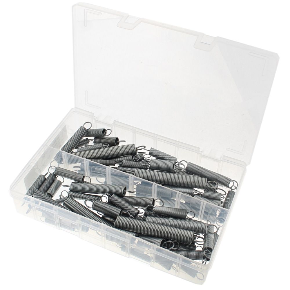 This assorted box contains 70 zinc-plated expansion (extension) springs for general repair, maintenance, and fabrication work. Made from steel with a protective zinc finish, the springs resist rust and wear in outdoor and workshop environments. Each spring provides reliable pulling force to return levers, hold panels closed, maintain tension on cables, or stabilise moving parts. The selection covers a range of small to medium sizes suited to garden machinery, light plant, automotive fittings, and workshop jigs. Typical uses include throttle returns on lawn mowers, linkages on compact machinery, light latches, and guards. The springs are supplied in an organised assortment box for quick identification, helping tradespeople and DIY users keep common sizes to hand and complete repairs without delay.