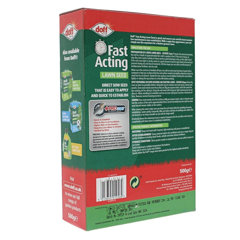 Doff Fast Growing Lawn Seed 500g is an efficient solution for achieving a lush, green lawn quickly. Designed for easy application, these direct sow seeds are ideal for both DIY enthusiasts and professional gardeners. The seeds feature a unique +PROCOAT coating, which enhances germination and ensures robust growth. With a weight of 500g, this pack covers up to 20 square metres, making it suitable for small to medium-sized gardens. The seeds are formulated to be less attractive to birds, ensuring more seeds germinate successfully.