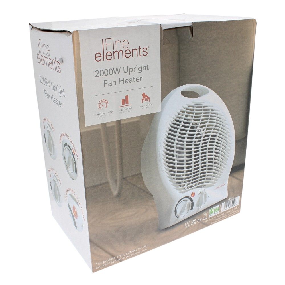 The Fine Element 2000W Portable Upright Fan Heater is a compact electric heater designed for quick, targeted warmth in smaller spaces. It uses a durable copper coil heating element to produce heat efficiently, while a built-in fan distributes warm air effectively across rooms, with an airflow reach of over 10 m. The lightweight 0.9 kg body and integrated carry handle make it easy to move between areas and store when not in use. With three modes-Fan (no heat), 1 kW, and 2 kW-you can choose between simple air circulation, gentle background heat, or fast warm-up. Finished in white with a free‐standing upright form, this 240 V heater is well suited to homes, offices, site cabins, garages, and workshops where temporary or supplementary heat is needed.