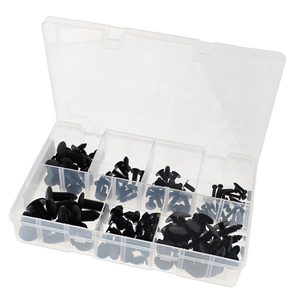 The Fir Tree Fixings Assorted Box is a 140-piece selection of barbed push-in retainers for quick, secure panel attachment across construction, garden and automotive equipment. Made from tough acetal and nylon in black, these fasteners grip firmly without nuts or bolts, making them useful for guards, trims, access panels and light brackets. The assortment spans common hole sizes from 3.0 mm to 10.0 mm, with typical panel thickness ranges to suit varied substrates: 3.0 mm (4.0-12.0 mm), 4.0 mm (3.5-5.0 mm), 5.0 mm (1.5-11.0 mm), 6.0 mm (3.0-8.0 mm), 7.0 mm (0.7-20.0 mm), 7.9 mm (2.0-5.0 mm), and 10.0 mm hole (1.5-20.0 mm). Supplied under MPN 105 205, it's a practical kit for maintenance and repairs on mowers, generators, compressors and small plant.