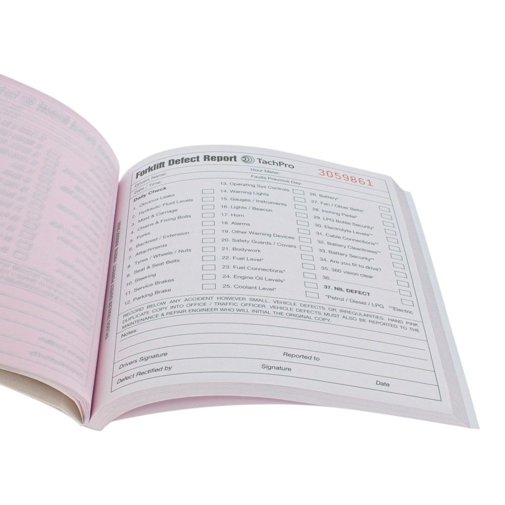 Pre-use inspection pad, defect report book, operator log, FLT safety record, compliance record pad, service check log, forklift audit book, daily safety record, equipment condition log, defect notification pad.