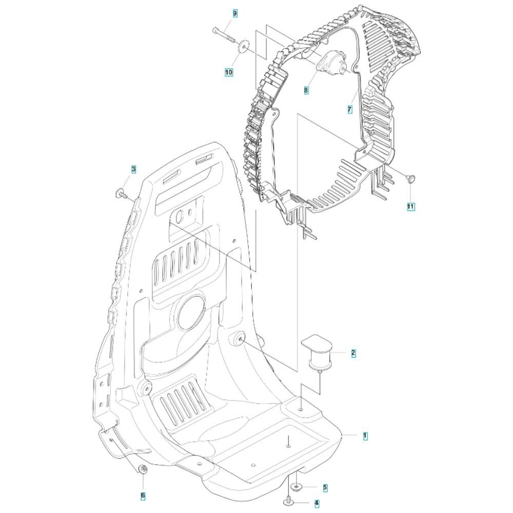 The Frame Assembly for the Husqvarna 580BFS Mark III Blower is designed to support and protect the blower's internal components. This genuine Husqvarna part ensures stability and durability during operation. The assembly includes various components such as brackets, fasteners, and protective covers, all contributing to the blower's efficient performance.