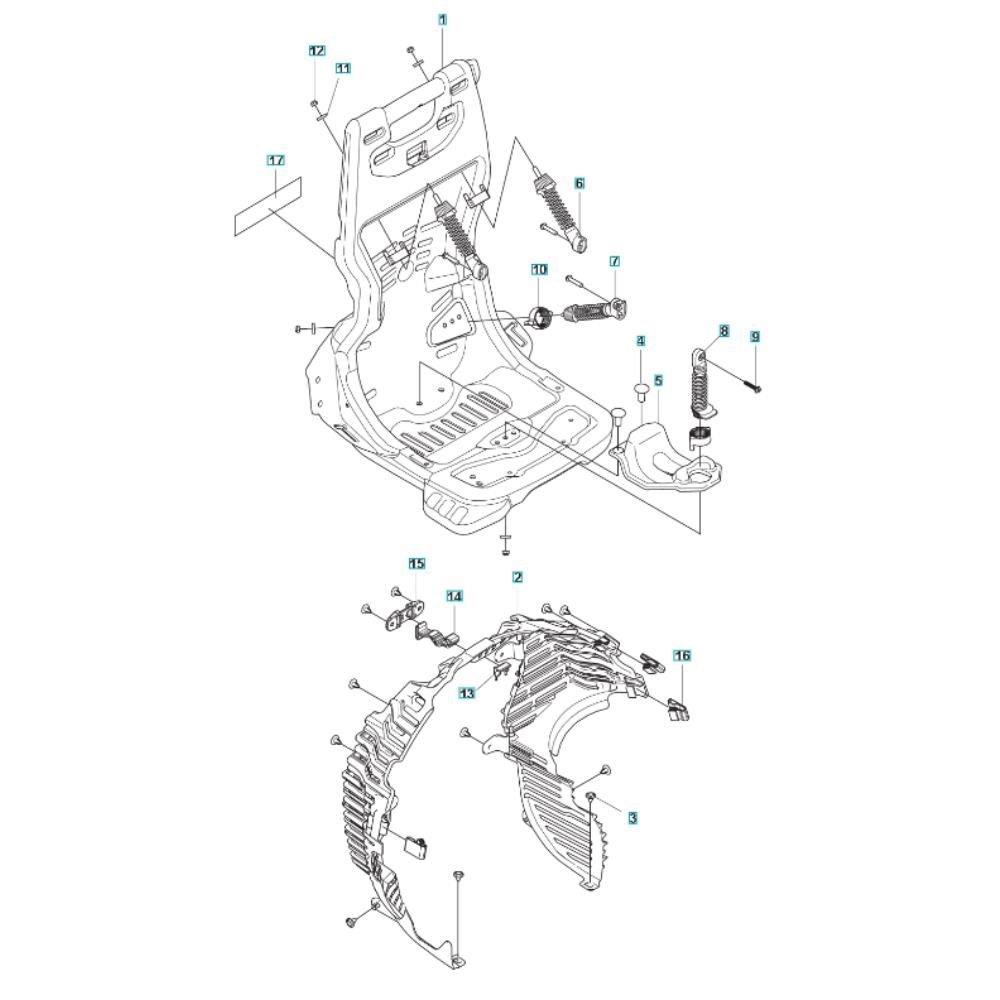 The Frame Assembly for the Husqvarna 590BFS Blower is designed to support and protect the blower's internal components. This assembly ensures stability and durability during operation, helping to maintain optimal performance. It includes various parts such as brackets, mounts, and fasteners, all essential for the secure housing of the blower's engine and other critical elements.