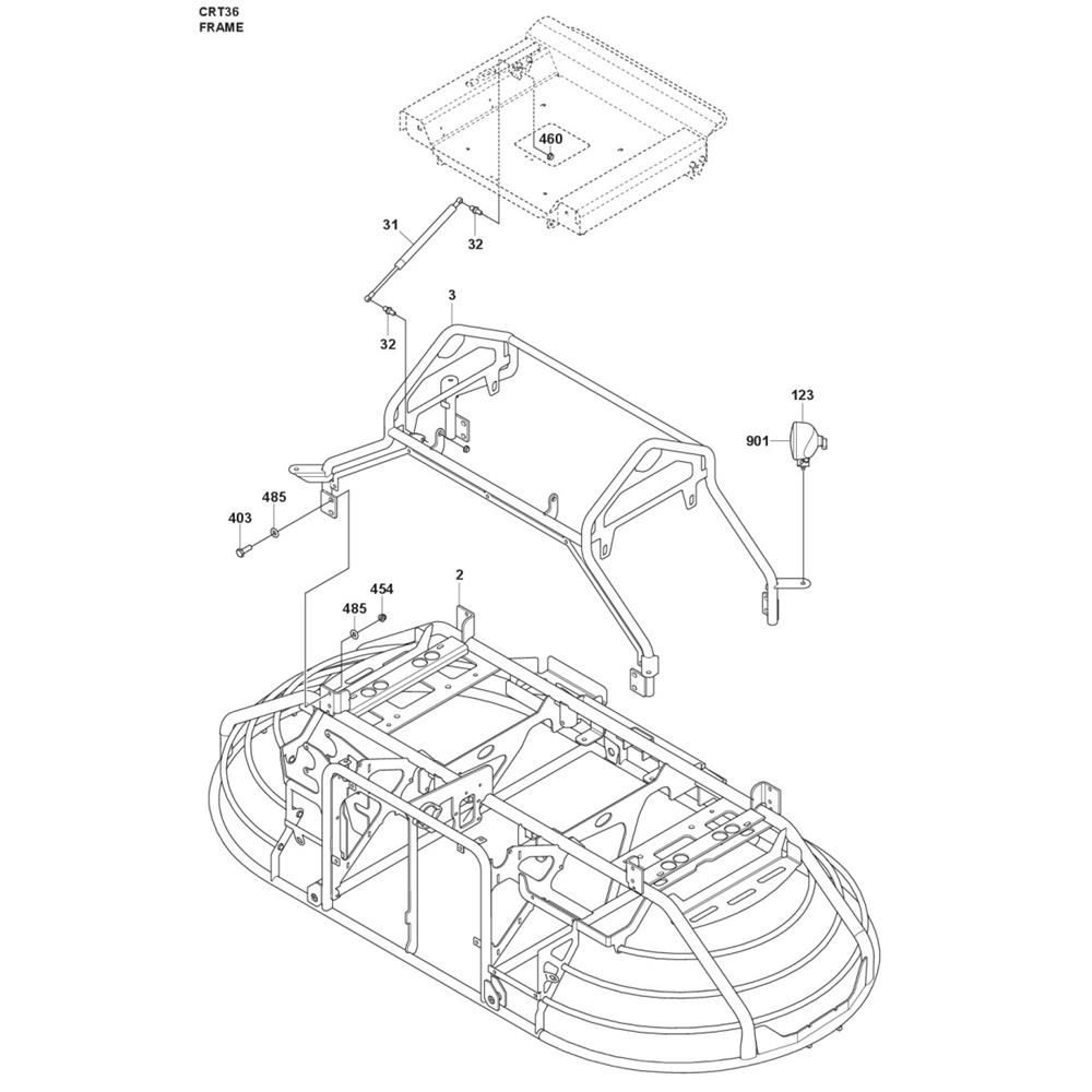The Frame Assembly for the Husqvarna CRT 36 Ride-On Trowel is crucial for maintaining structural integrity and operational efficiency. This assembly includes components such as brackets, mounts, and supports, ensuring stability during use. Designed for durability, it helps in distributing weight evenly, providing a smooth and consistent finish on concrete surfaces.